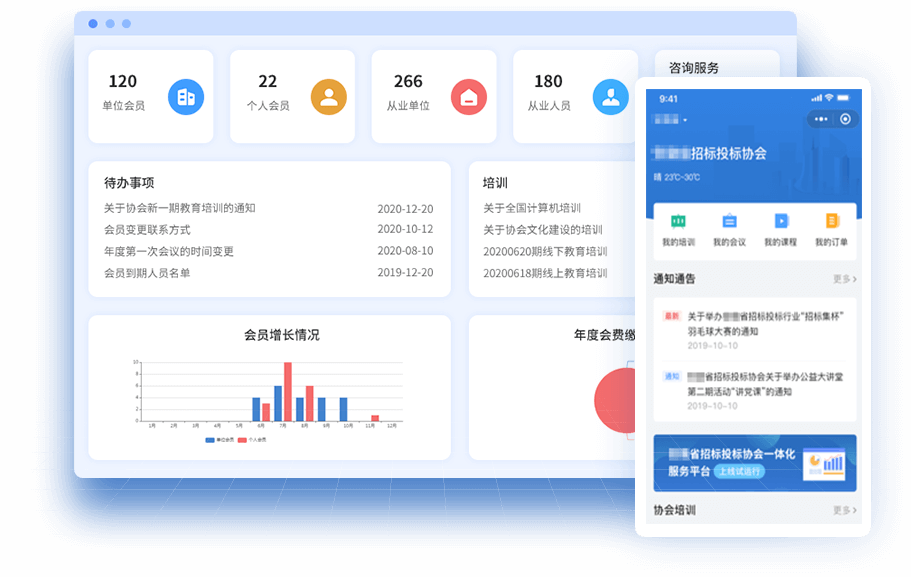 安訊協會一體化服務平臺,是按照“互聯網+社會組織”的理念,采用 “云計算、大數據”等先進信息技術,立足協會服務會員、規范市場秩序、開展行業自律等需求,建立的一體化管理與服務平臺,集成會員、從業人員、從業單位管理,通知、培訓、會議、咨詢、資源、直播服務,以及門戶網站、移動應用,實現協會各業務數字化整合,全面提升各方獲得感,為協會服務國家、社會、行業提供全面的信息化支撐。